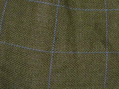 :シックな秋色カーキにターコイズブルーのラインがとても奇麗です。ヘリンボーン織りにウィンドーペーンの入った布で、しなやかでシカッリしています。