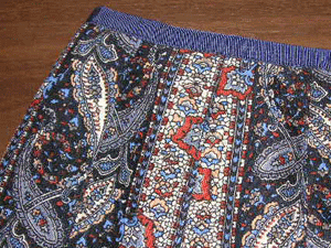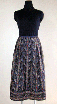 :ウールモスリンのペーズリープリントです。イタリア製のクラシックな柄ですので、上品でとても素敵な布です。左の画像は、ほぼ実物大の大きさです。実物の方が深みの有る色合いです。全体のイメージは上のスカートの色合いをご参考になってくださいませ。モスリンは強撚の平織りのウール地で私の大好きな布の一つです。クラシックな雰囲気が魅力です。学生の頃、アンティークな花柄のワンピースを作って着ていた事を思い出します。ウールモスリンは、なんともノスタルジックな布です。