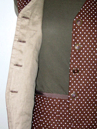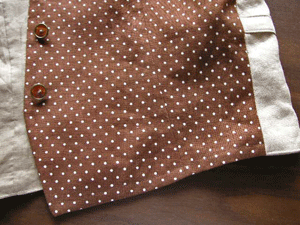 ボタンホールは、家庭用ミシンによるもので、糸色は表の茶色に合わせてあります。