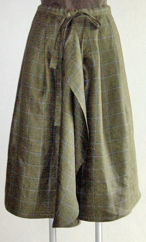 :ラップスカートは、上前がはだける事が気になりますが、この型は、下前も中心よりにタックがあり布の分量感が有るので、気になりません。