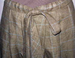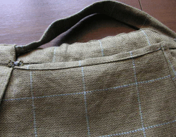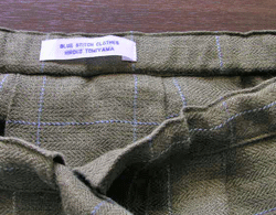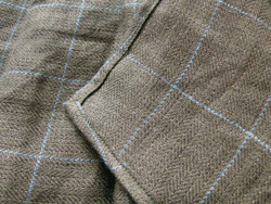 :シックな秋色カーキにターコイズブルーのラインがとても奇麗です。ヘリンボーン織りにウィンドーペーンの入った布で、しなやかでシカッリしています。