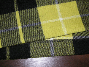 :レモンイエローに黒とオフ白のラインがモダンなウールのタータンチェックのSkirtです。イエローベースですが、大人っぽい色柄が気に入って以前に手に入れた布です。