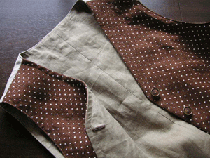 :クラシックな雰囲気の茶色にオフホワイトのピンドット柄のベストは、ウエスト下約10cm丈の着易いベストです。