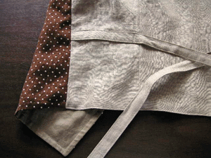 :軽い雰囲気でしかもちゃんとした作りにしたかったので、内布にも裏地ではなくとてもすてきな雰囲気のしかも薄くてシカッリ目のつんだラミーの布を使用して、リバーシブル仕立てのように表と裏を付き合わせた使用に仕上げました。